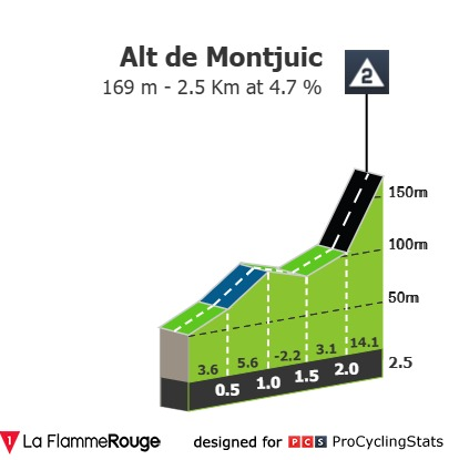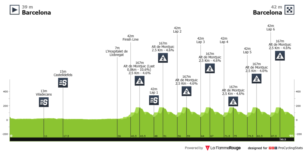 La más que típica etapa final de La Volta a Catalunya con sus menos de 100km y sus múltiples subidas a Montjuic. No suele dictaminar el vencedor, pero ya vimos lo que hizo Roglic en ediciones anteriores. Puede pasar de todo y puede dar la vuelta a la general, pero también puede ser que lleguemos en sprint reducido.